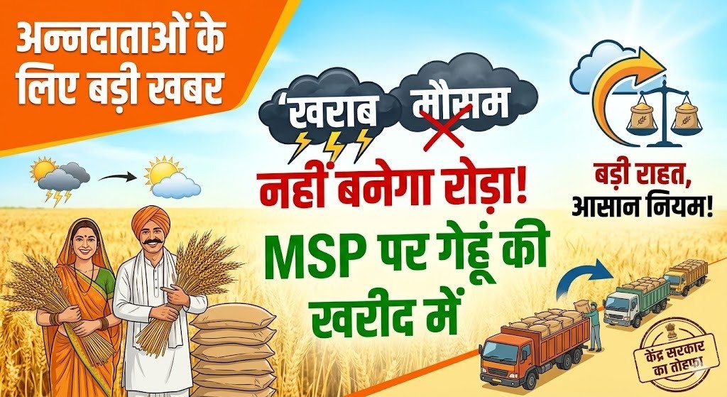 नई दिल्ली: कुदरत की मार झेल रहे किसानों के लिए केंद्र सरकार ने उम्मीद की एक नई किरण दिखाई है। हाल ही में हुई बेमौसम बारिश और ओलावृष्टि ने खेतों में खड़ी गेहूं की सुनहरी फसल को काफी नुकसान पहुँचाया था। किसानों के माथे पर चिंता की लकीरें थीं कि क्या गुणवत्ता कम होने के कारण उन्हें फसल का सही दाम मिलेगा? इसी संकट को देखते हुए सरकार ने गेहूं खरीद के नियमों (Procurement Norms) में ढील देने का ऐतिहासिक फैसला लिया है।