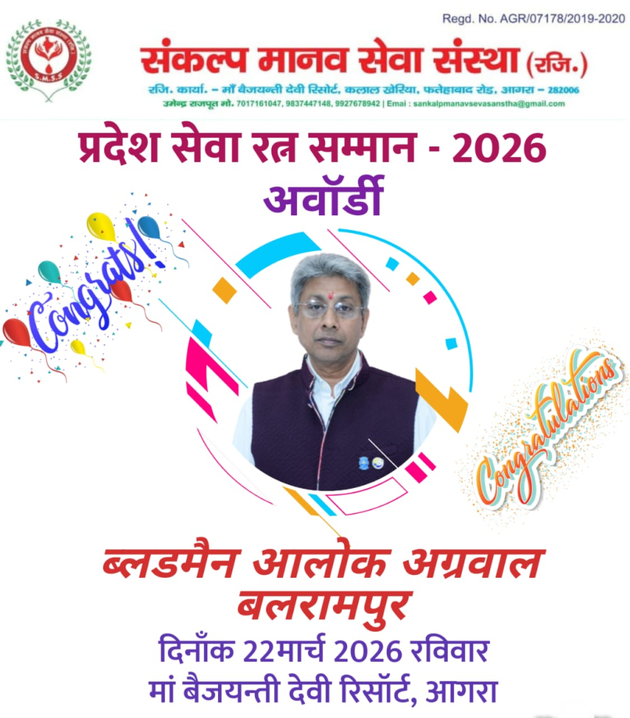 छोटी काशी के नाम से प्रसिद्ध बलरामपुर के आलोक अग्रवाल और वैभव त्रिपाठी को आगामी 22 मार्च 2026 को आगरा में आयोजित एक भव्य कार्यक्रम में “प्रदेश सेवा रत्न सम्मान 2026” से नवाजा जाएगा। यह कार्यक्रम संकल्प मानव सेवा संस्था (रजि.) द्वारा आयोजित किया जा रहा है, जिसमें एक विशाल रक्तदान शिविर का भी आयोजन होगा।